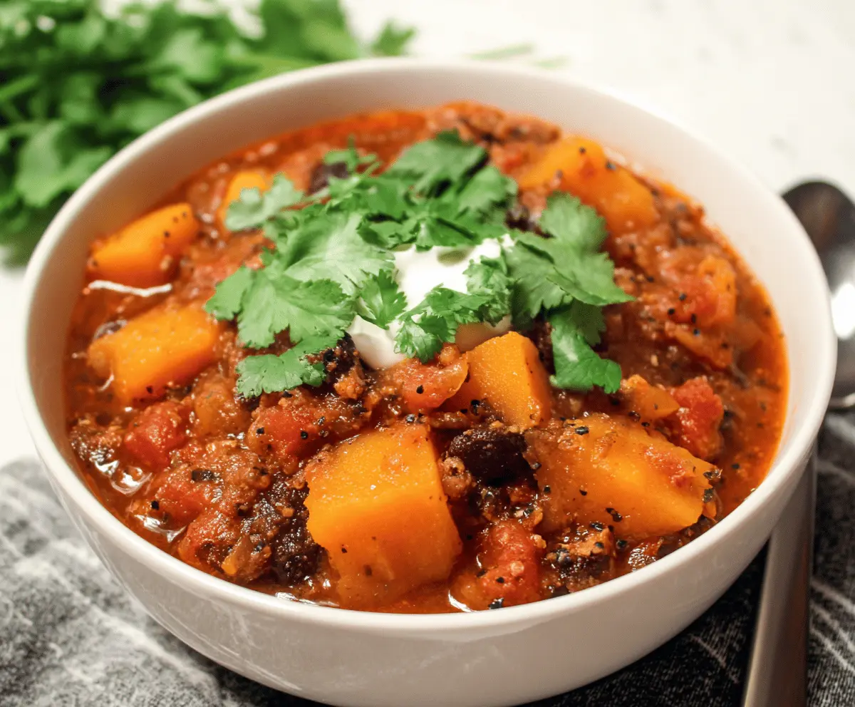 Creamy butternut squash chili topped with fresh herbs and colorful vegetables, perfect for a hearty and healthy meal.